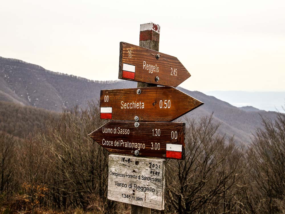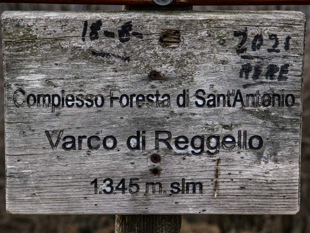 La località può essere raggiunta anche in auto e da dove ragionevolmente si può considerare l’inizio del percorso escursionistico (la traccia gpx inizia da qui). Ponte a Enna è caratterizzato da un grande ponte ad arco dell’antica via Reggellese adiacente la costruzione che in origine era un mulino. Continuiamo sulla strada a fondo naturale sul fianco della valle e raggiungiamo il punto dove la valle si biforca nella confluenza tra il torrente Resco e il Borro di sant’Antonio. La strada continua e raggiungiamo il Ponte di Macereto (620 m) nell’omonima località. Attraversiamo il torrente Resco sull’antico ponte e continuiamo sulla stradella che si restringe ma sempre ben agevole. Alcuni attraversamenti del torrente permettono di godere lo scorrere delle acque con cascatelle caratteristiche. Siamo nella zona di Massa Malabergo. Alcune zone del Pratomagno così sono chiamate Masse riferendosi ai popoli originari o a luoghi particolari. Alcuni tornanti ci portano in quota fin dove la pendenza diminuisce. Una sbarra indica l’ingresso nella riserva demaniale della Foresta di Sant’Antonio. Mente si cammina, si può notare come il sentiero conserva sempre una notevole larghezza e in vari tratti il bel lastricato testimonia l’importanza del percorso nel passato. Infatti come già prima descritto, siamo sull’antica via Reggellese tra Casentino e Valdarno importante per i commerci e anche per la transumanza. Aumentando la quota, cambia anche il tipo di vegetazione, oltre al castagno cominciano ad apparire il carpino, l’ontano e i faggi. Attraversiamo ancora il Resco su un ponticello in un bosco dove ormai i faggi sono predominanti. La salita è costante e incrociamo la strada forestale a Pian Tortorelli (1041 m) o Massa Regina dove è presente una bacheca. Poco sopra è possibile vedere ancora i resti di uno stazzo per le pecore per la sosta durante la transumanza. Il sentiero con qualche giravolta sale attraversando una bella faggeta e raggiunge la dorsale che ci condurrà al crinale principale del Pratomagno. Incontriamo poco prima del crinale una sorgente d’acqua chiamata Fonte del Varco. In breve raggiungiamo Varco di Reggello (1346 m) sull’ampia dorsale. Da qui lo sguardo spazia dal Valdarno al Casentino e oltre. Le grandi prateria della sommità del Pratomagno, offrono scorci panoramici immensi con la possibilità di vedere animali e uccelli soprattutto rapaci. Per il rientro è possibile percorrere il sentiero dell’andata oppure fare un altro percorso allungando l’itinerario ma godendo di luoghi altrettanto attraenti per l’acqua e gli ambienti naturali.