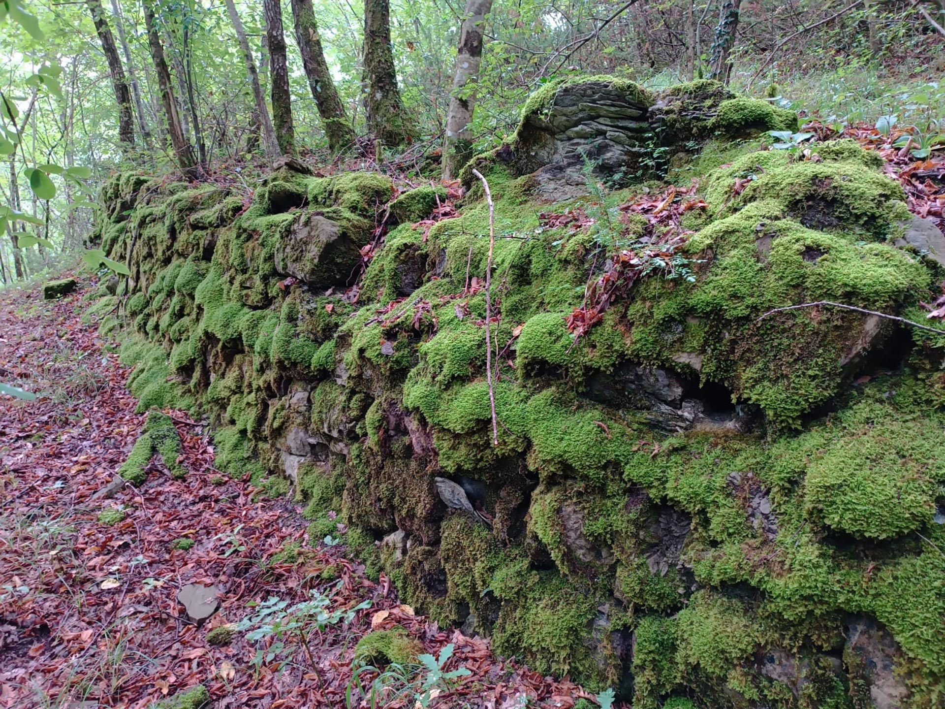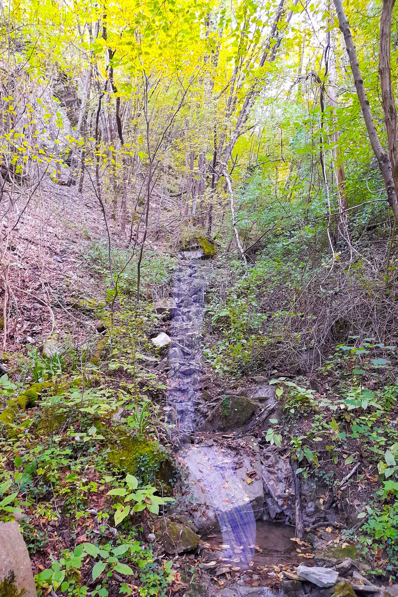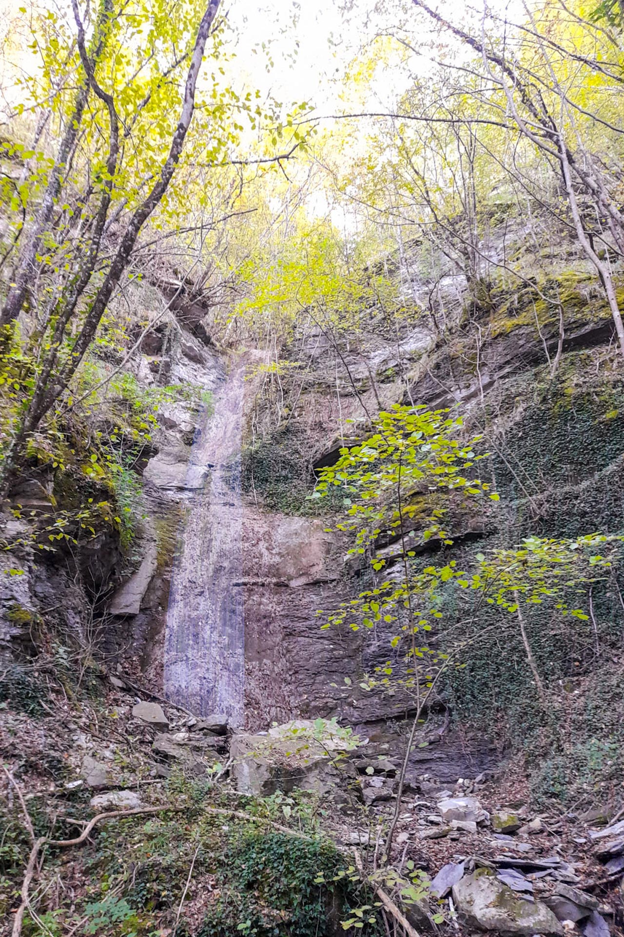 Da qui torniamo indietro per circa 230 metri per poi prendere a sinistra una vecchia mulattiera che ci fa coprire 30 metri di dislivello in poco più di 200 metri. Lungo la salita notiamo una vecchia conduttura abbandonata nella vegetazione, testimonianza archeologico-industriale degli scavi fatti per estrarre il gas. La pista interseca poi un'altra antica strada, il “Sentiero dei muri fioriti” che prendiamo svoltando a sinistra. In meno di 80 metri raggiungiamo il piccolo torrente visto prima. Dopo aver ammirato la cascatella e le belle vedute sui monti dell’Appennino, riprendiamo il sentiero da cui siamo arrivati e oltrepassiamo il bivio continuando sulla solita traccia. Lungo la traccia, ora per la maggior parte pianeggiante troviamo antichi muretti a secco, coperti di muschi e fiori spontanei, che furono creati dai vecchi abitanti della zona per coltivare e governare il bosco. Rimaniamo sullo stesso sentiero per rientrare al Borgo e alle auto (circa 700 metri dal precedente bivio).