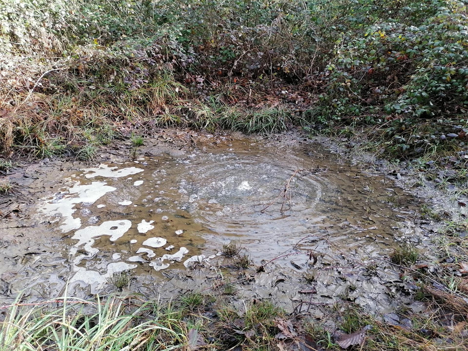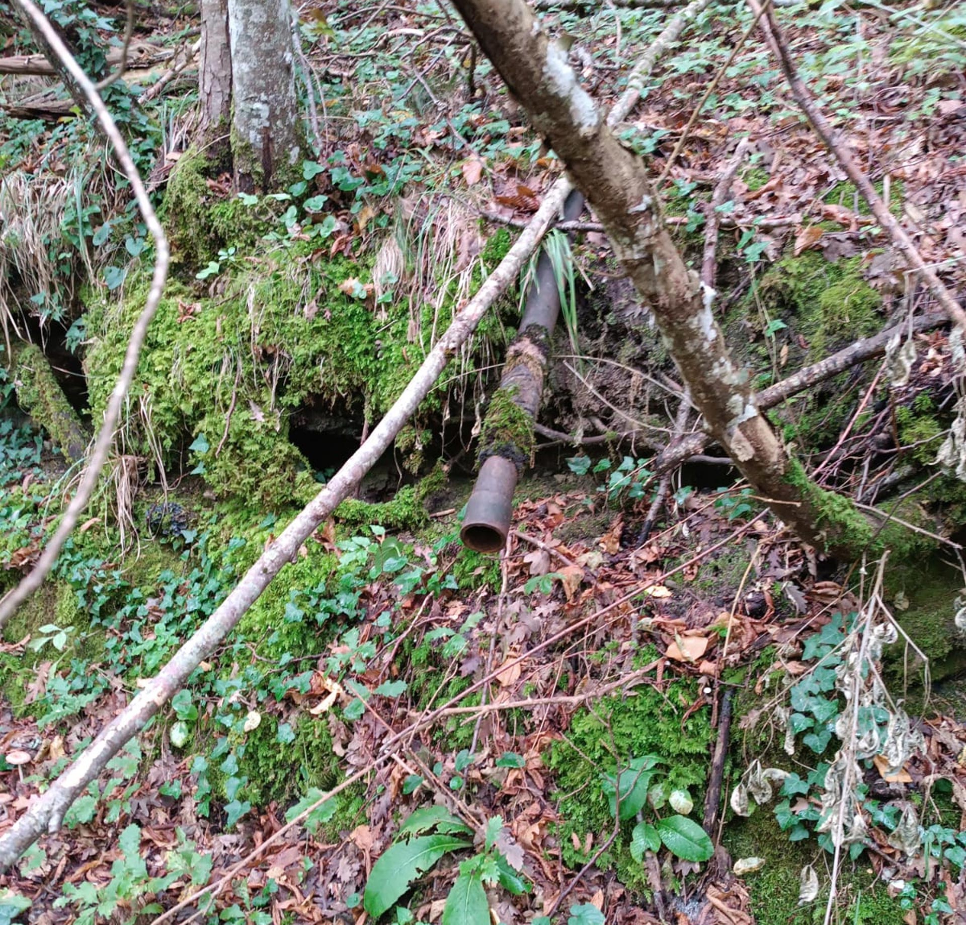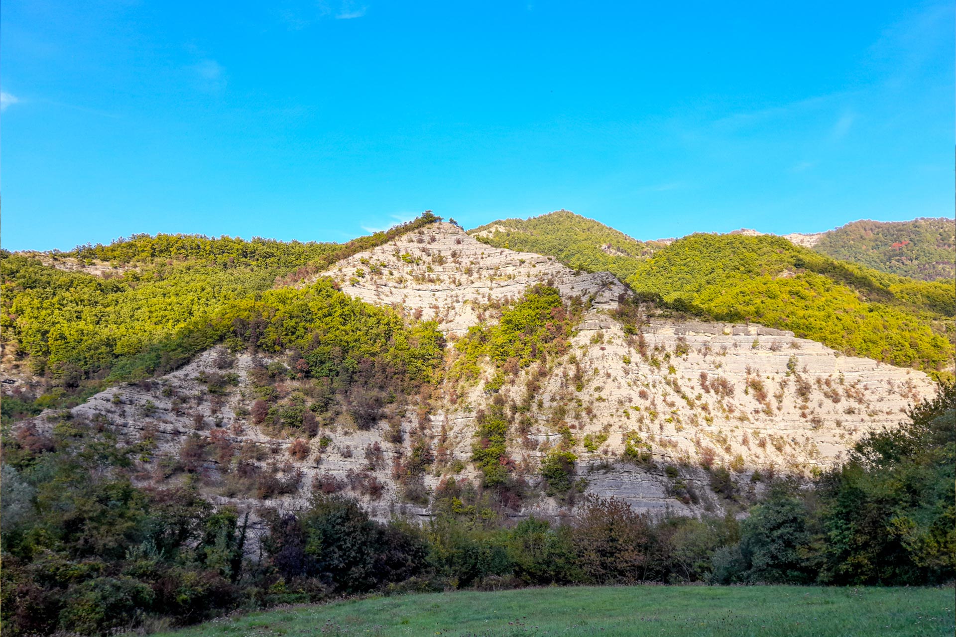 Da qui torniamo indietro per circa 230 metri per poi prendere a sinistra una vecchia mulattiera che ci fa coprire 30 metri di dislivello in poco più di 200 metri. Lungo la salita notiamo una vecchia conduttura abbandonata nella vegetazione, testimonianza archeologico-industriale degli scavi fatti per estrarre il gas. La pista interseca poi un'altra antica strada, il “Sentiero dei muri fioriti” che prendiamo svoltando a sinistra. In meno di 80 metri raggiungiamo il piccolo torrente visto prima. Dopo aver ammirato la cascatella e le belle vedute sui monti dell’Appennino, riprendiamo il sentiero da cui siamo arrivati e oltrepassiamo il bivio continuando sulla solita traccia. Lungo la traccia, ora per la maggior parte pianeggiante troviamo antichi muretti a secco, coperti di muschi e fiori spontanei, che furono creati dai vecchi abitanti della zona per coltivare e governare il bosco. Rimaniamo sullo stesso sentiero per rientrare al Borgo e alle auto (circa 700 metri dal precedente bivio).